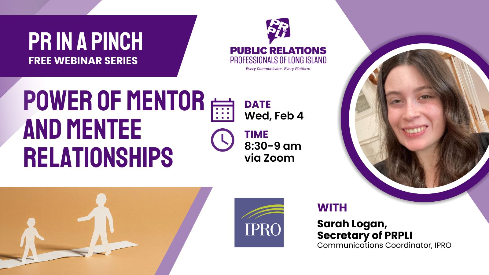 Zoom EventHave you ever wondered how you could accelerate your career growth in public relations? 🤔 Mentorship just might be the answer! Join PRPLI Secretary Sarah Logan as she discusses the importance of the mentor/mentee relationship and how building meaningful connections can advance your professional goals on Wednesday, February 4 at 8:30 am.